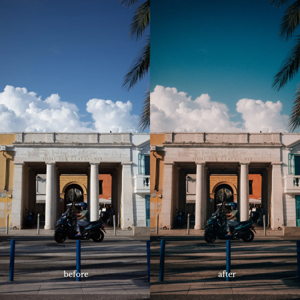 The ultimate vibe for warm beach days, soft stone buildings and the French Riviera. Two versions, one for day and one for twilight, and another that works better for mobile phone jpg photos.